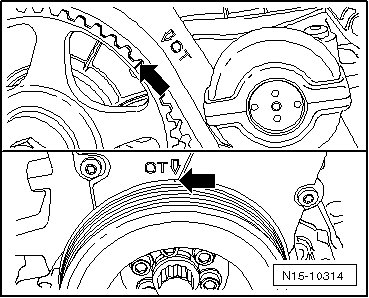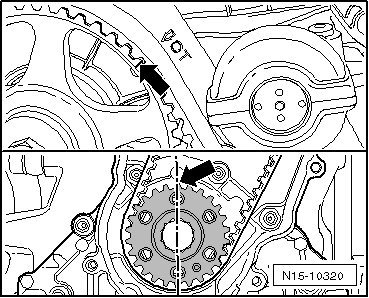 - Check the valve timing again: the marks - arrows - must be aligned.
