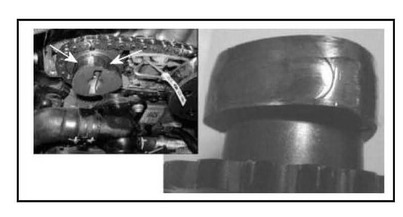 The wear on the camshaft lobe can also lead to wear on the base of the high pressure fuel pump cam follower.