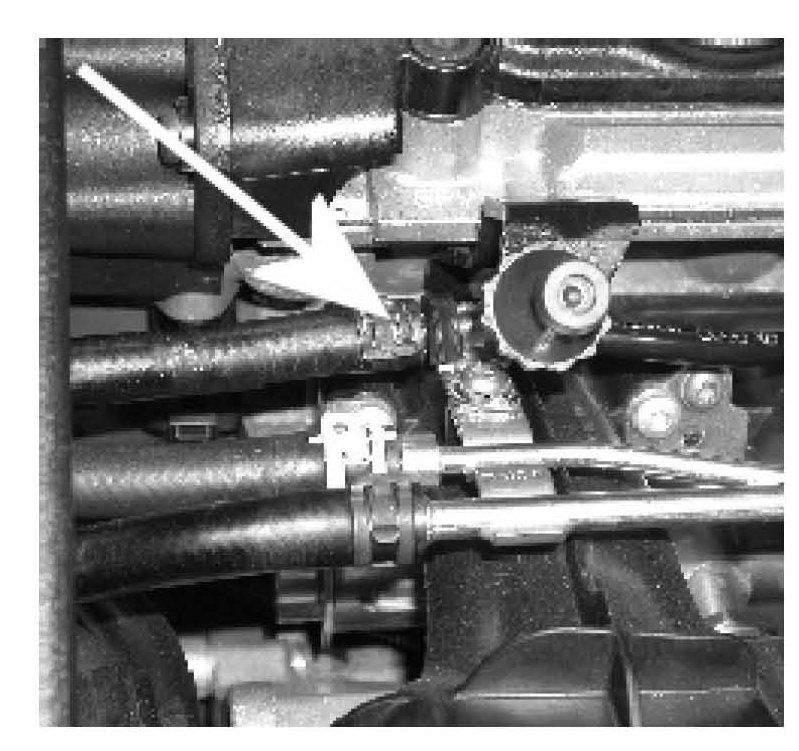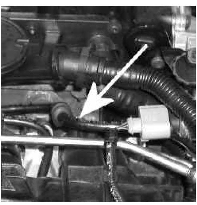 ^ Disconnect the vacuum pipe hose at the orifice -arrow- and remove pipe.