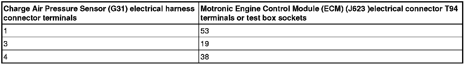 - Using a multimeter, check the Charge Air Pressure Sensor (G31) electrical harness connector terminals to the Motronic Engine Control Module (ECM) ( J623) electrical harness connector T94 terminals for resistance.