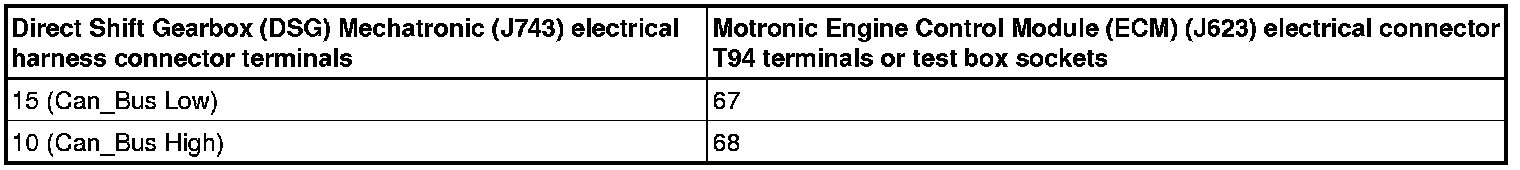 - Using a Multimeter, check the Direct Shift Gearbox (DSG) Mechatronic (J743) electrical harness connector to the Motronic Engine Control Module (ECM) ( J623) electrical harness connector T94 for resistance.