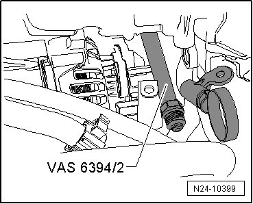 The (VAS 6394) is under high fuel pressure. Disconnect the connector from the fuel pressure sensor when the engine is running. This reduces the pressure to approximately 6 bar. Turn off the ignition. Place a cloth around the fuel pressure sensor, then carefully loosen the fuel pressure sensor to release the remaining pressure.