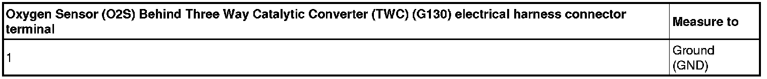 - Using a multimeter, check the Oxygen Sensor (O2S) Behind Three Way Catalytic Converter (TWC) (G130) electrical harness connector terminals 1 to 2 for resistance.