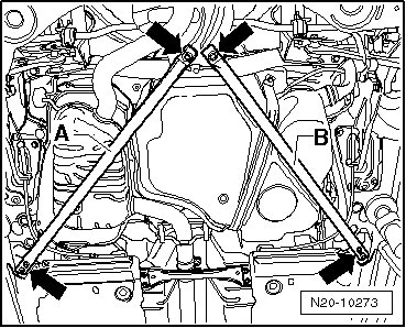 - Remove the tensioning straps and bolts - arrows -. Support the fuel tank using (V.A.G 1383 A) while doing so
