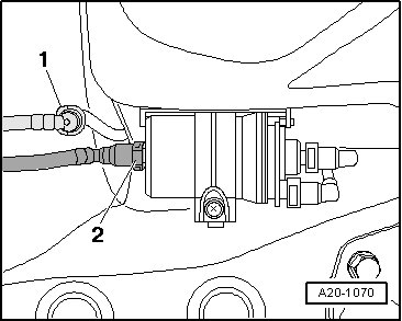 - Disconnect the ventilation line - 1 - (white) and vacuum line - 2 - (green) for the Leak Detection Pump (LDP) (V144) behind the fuel tank by pressing in the circlips.