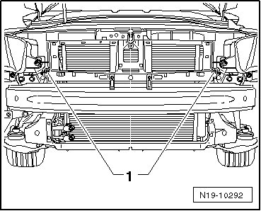 • The A/C condenser bolts are difficult to access. With the help of a second technician, lift the charge air cooler out of the lower mounts. Now the charge air cooler can be tilted back and forth and the bolts are accessible.