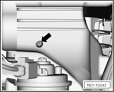 - Remove the bolt - arrow - for the A/C condenser pipes.