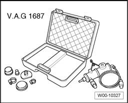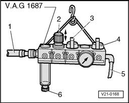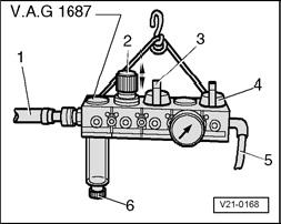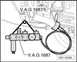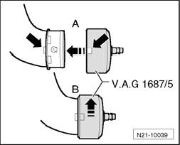 - Before removing adapter, discharge pressure in testing circuit by pulling off coupling from adapter V.A.G 1687/5.