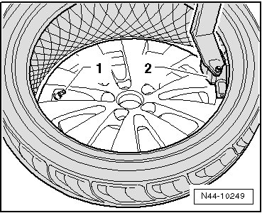 - Turn disc wheel on tire mounting device so that tire valve/tire pressure sensor - 1 - stands on opposite side of mounting head - 2 -.