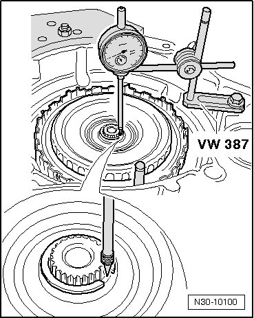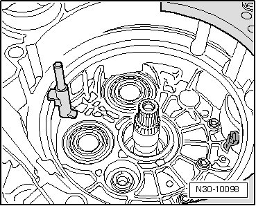 The transmission must be clamped secure in the holding fixture (VW 313) or in the engine and transmission holder (VAS 6095). Refer to => [ Transmission, Transporting and Securing to Assembly Stand ] Procedures. It must not be rotated.
