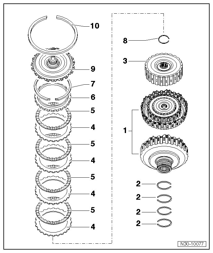 Assembling the multi-plate clutch requires special care, because all of the components were balanced to each other at the manufacturer. Do no rotate them from their original position, otherwise imbalances will occur, creating diminished shift comfort and life span.