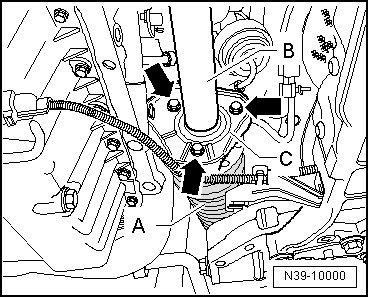 - Unbolt the intermediate shaft - B - from the mounting bracket - C - - arrows - and pull it off from the stub shaft of the transmission.