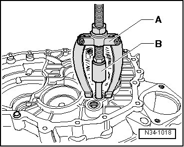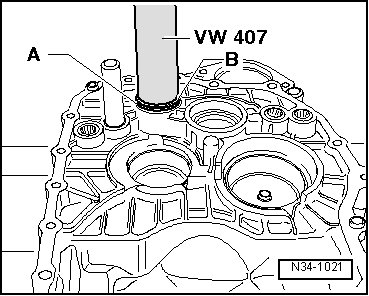 - During pressing sequence, place thrust washer - B - for reverse shaft on needle bearing.