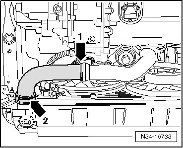 - Disconnect the charge air hose connections - arrows 1 and 2 -.