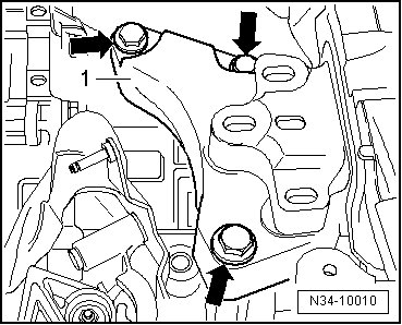 - Install the transmission mount bracket - 1 - to the transmission with new bolts - arrows - and tighten to specifications.