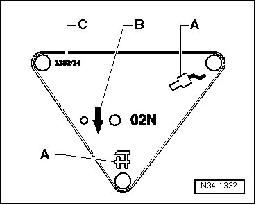 - Place the (V.A.G 1383 A) under the vehicle, with the arrow symbol - B - on the (3282/33) pointing to the front of the vehicle.