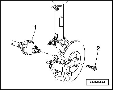 • On vehicles with a intermediate shaft, loosen the bolt - 2 - for the right drives axle - 1 - a maximum of 90° with the vehicle resting on its wheels, otherwise the wheel bearing will be damaged.