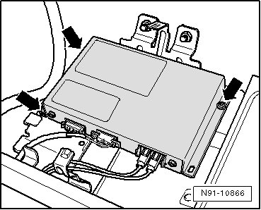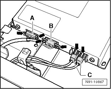 - Disconnect harness connectors - A and B - on digital satellite radio tuner, to do so press locking mechanisms - arrows - and then disconnect the connectors.