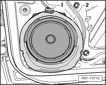 - Release locking mechanism of harness connector - 1 - and disconnect it. Remove rubber spacer ring - 2 - from speaker.