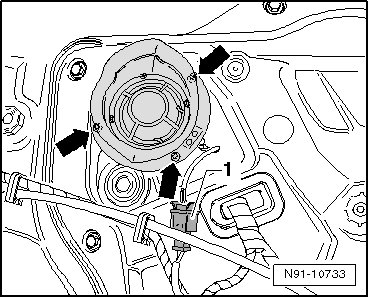- Release locking mechanism of harness connector - 1 - on bottom of speaker and disconnect it. Remove screws - arrows -.
