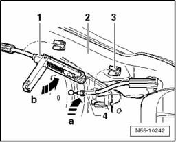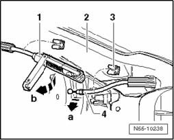 - Connect release cable coupling - 1 - in - direction of arrow b - and lock coupling in clips - 3 - on lock carrier - 2 -.