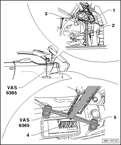 - Place the (VAS 6365) in the mounting hole in the main hinge - 1 - and rotate the base - 4 - so that it is not positioned in the opening in the longitudinal.