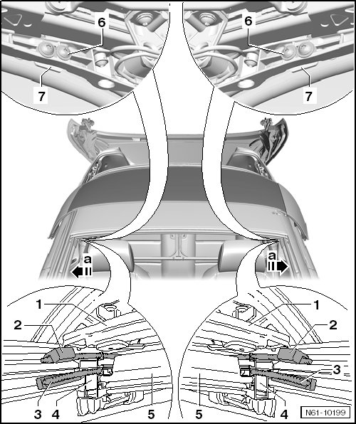 - Move the roof pillar toward the outside - arrows a - until the slider in the slotted guide rail - 4 - can be guided over to front guide rails - 2 - without touching.