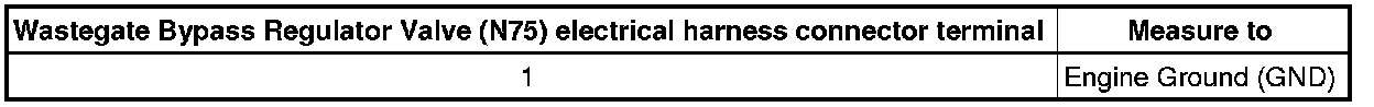 - Using a multimeter, check the Wastegate Bypass Regulator Valve (N75) electrical harness connector terminal 1 to engine ground.