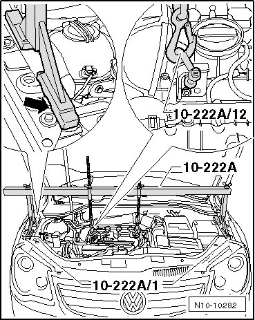 If the engine mount will only be adjusted, a bracket with spindle and hook (10 - 222 A/10) on the engine side is enough. It is not necessary to remove the air filter housing, battery tray and battery.