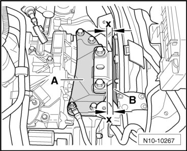 On the transmission side, the edges of the transmission mount bracket - A - and transmission mount - B - are parallel.