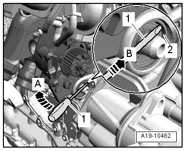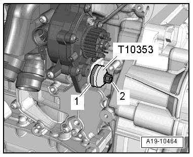 - Install the (T10353) onto the seal - 1 - and press it into the cylinder block all the way with the bolt - 2 -; when doing this, do not bend the seal.