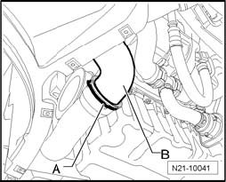 - Release securing clip - A - and disconnect hose - B - from charge air pipe.