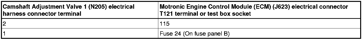 - Using a Multimeter, check the Camshaft Adjustment Valve 1 (N205) for resistance at the component terminals.
