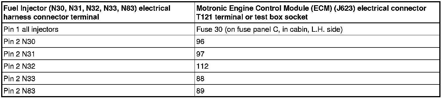 This procedure is used to diagnose Fuel Injectors (N30, N31, N32, N33, N83).
