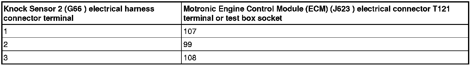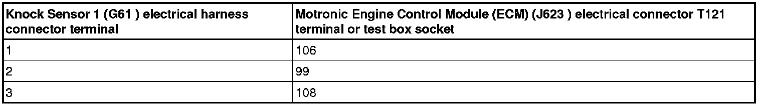 - Using a Multimeter, check Knock Sensor (KS) 1 (G61) or Knock Sensor (KS) 2 ( G66) component terminals 1+2 for a short to each other.