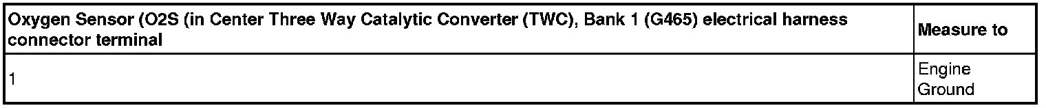 - Using a multimeter, check the Oxygen Sensor (O2S (in Center Three Way Catalytic Converter (TWC), Bank 1 ( G465) electrical harness connector terminal 1 to engine ground.