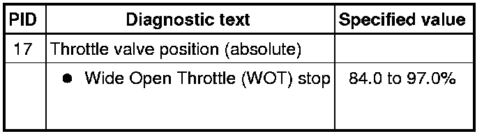 - Check specified value of throttle valve position (absolute) at Wide Open Throttle (WOT) stop: