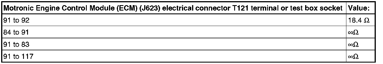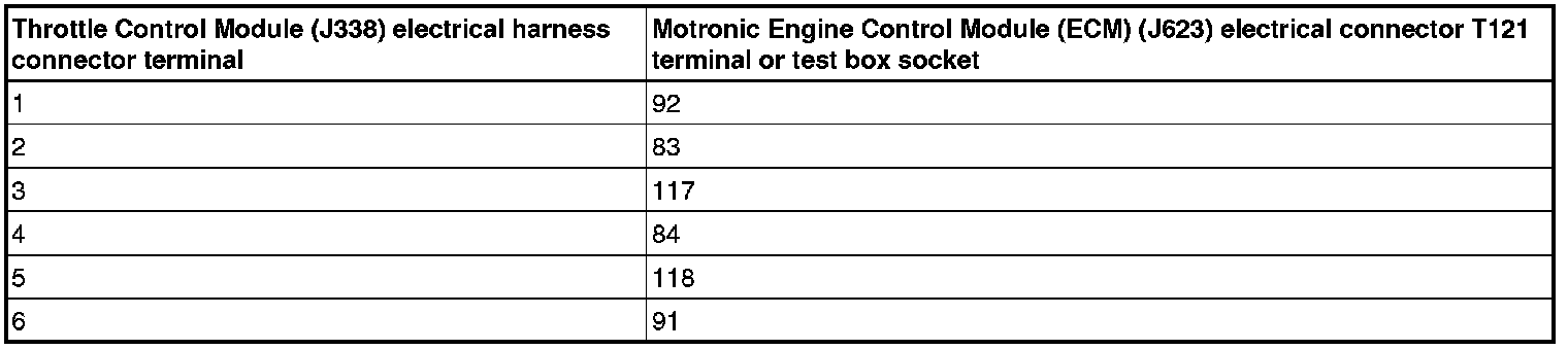 - Check resistance values of Throttle Control Module J338 at T121 terminal or test box