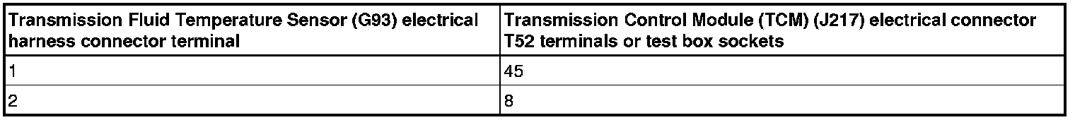 - Using a multimeter, check the Transmission Fluid Temperature Sensor (G93) electrical harness connector terminals to the Transmission Control Module (TCM) (J217 ) electrical harness connector T52 terminals for resistance.