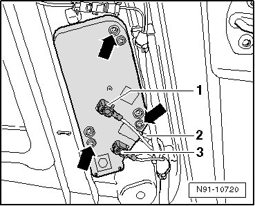 When installing, make sure that antenna connections in rear lid - arrows - and bolts on antenna amplifier - arrows - are metallically clean so that no contact problems occur.