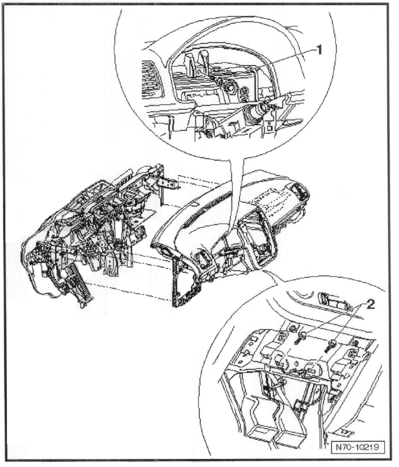 - Remove two bolts - 1 - (9 Nm) from front passenger airbag.
