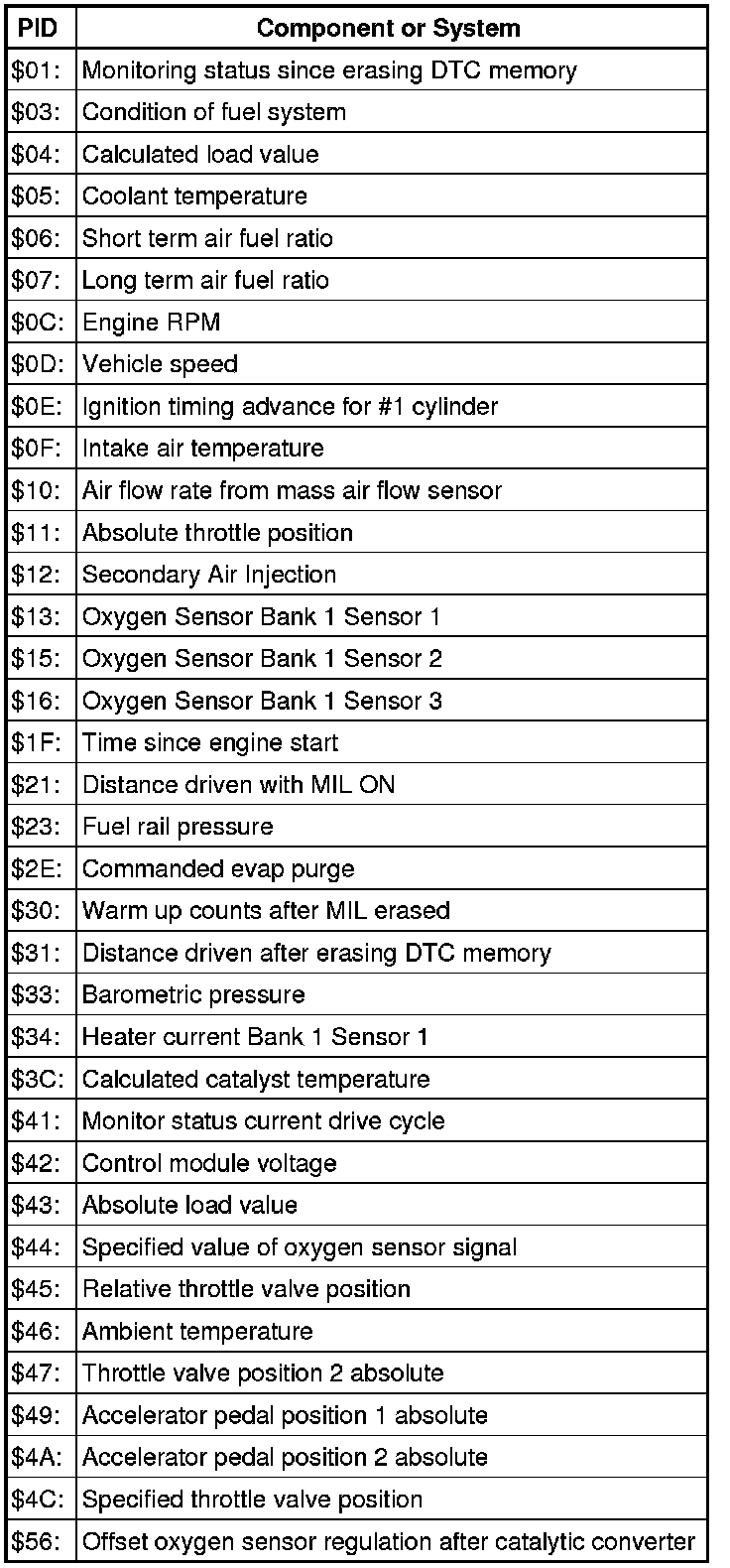 - From the following table, select the desired the "PID" that is to be monitored, e.g. "PID $05 Coolant temperature".