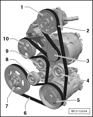 Removing and installing, refer to => [ Ribbed Belt ] Service and Repair.