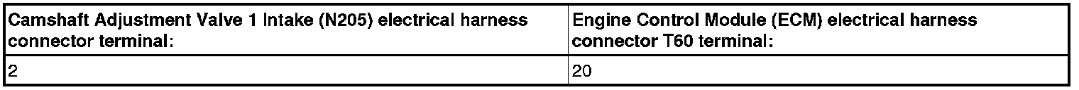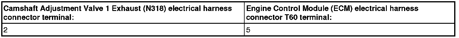 - Using a , Check the Camshaft Adjustment Valve 1 Intake (N205) or Camshaft Adjustment Valve 1 Exhaust (N318) electrical harness connector terminal 2 to the Engine Control Module (ECM) electrical harness connector for an open circuit.