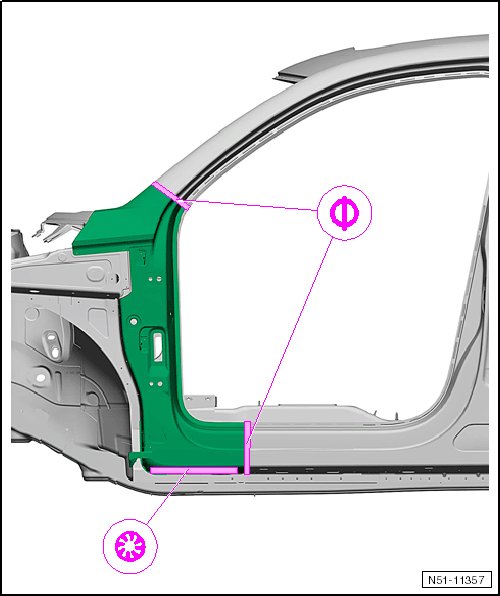 - Weld in A-pillar to the sill panel, gas-shielded arc plug weld seam.
