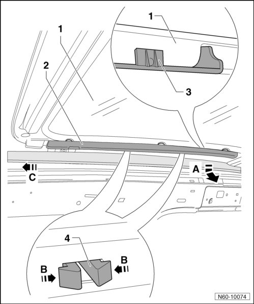 - Pull the trim - 2 - in the direction of - arrow A - downward and carefully lay the retaining tab - 3 - on the back side.