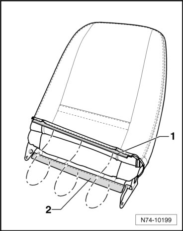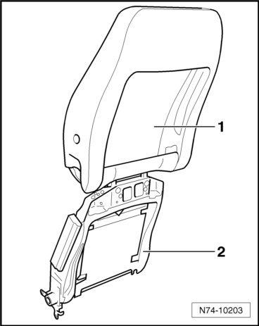 - Pull the cushion - 1 - up over both headrest guides and remove it from the backrest frame - 2 -.