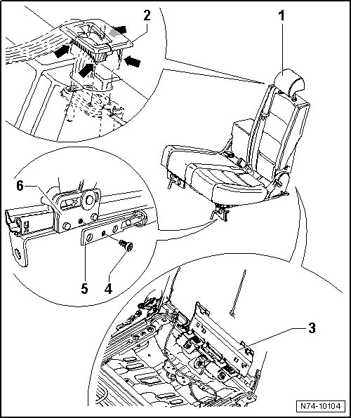 - Remove the screw - 7 - (40 Nm) and remove belt anchor - 6 - from the seat.
