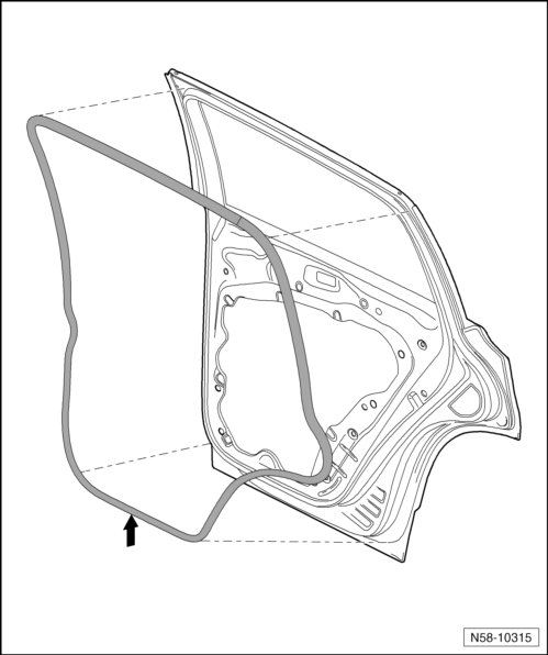 - Align outer door seal with vulcanized point - arrow - at the height of the lower hinge.