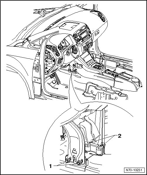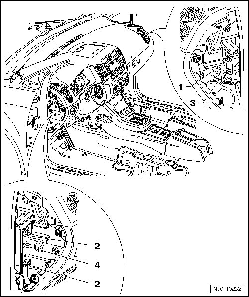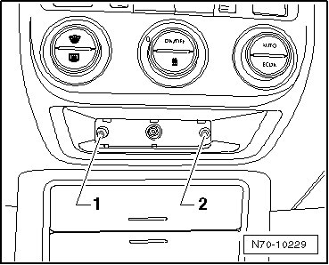 - Loosen the bolts - 1 - and - 2 - under the heater and air conditioning controls 2 to 3 turns (2.5 +/- 0.5 Nm).